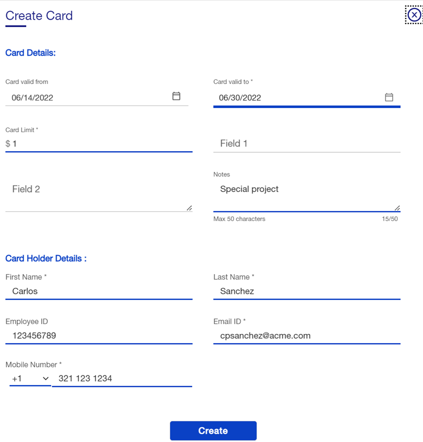 - Inscrivez la période de validité, la limite de crédit et les détails du titulaire de carte.